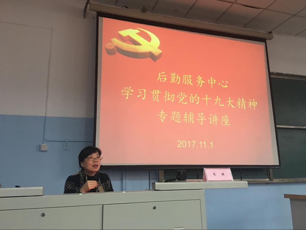 2017年11月1日下午,后勤服务中心在校本部10号教学楼第一合堂教室举办学习宣传贯彻党的十九大精神专题辅导讲座,邀请了我校马克思主义学院朱瑛教授辅导。中心领导、科级干部、全体党员、班组长及职工代表近200人聆听了讲座。